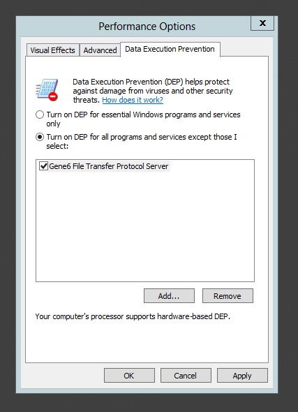 3) Add the server service executable (G6FTPServer.exe) to the DEP exception list.